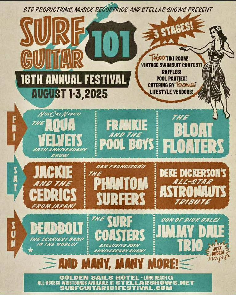 The array of authentic vintage Fender Blonde Brownface and similar amplifiers, outboard reverb units and speaker cabinets gracing the back of the stages are generously provided by longtime festival friend and colleague, Ran Mosessco, much respected in the international surf music community for his work with The Astroglides, The Sand Devils and now, with his newest project, The Scimitars. Additional amplifiers are provided by Jonpaul Balak.